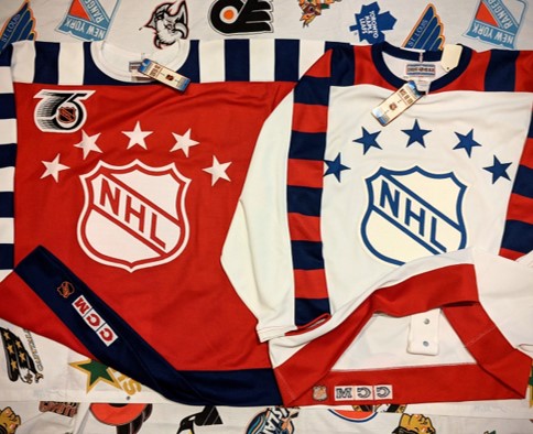 The league found ways for all teams to participate in the anniversary celebration using their jerseys. First, the NHL designed an incredible 75 year anniversary logo – arguably the greatest logo in NHL history – and had all teams wear it as a patch on their jerseys for the entire season. The other was by way of the All-Star Game. Much like the original six teams called back to an earlier era, the NHL ASG jerseys called back to the same era, the 1940s, and the players donned an updated version of their first official NHL All-Star Game jerseys.