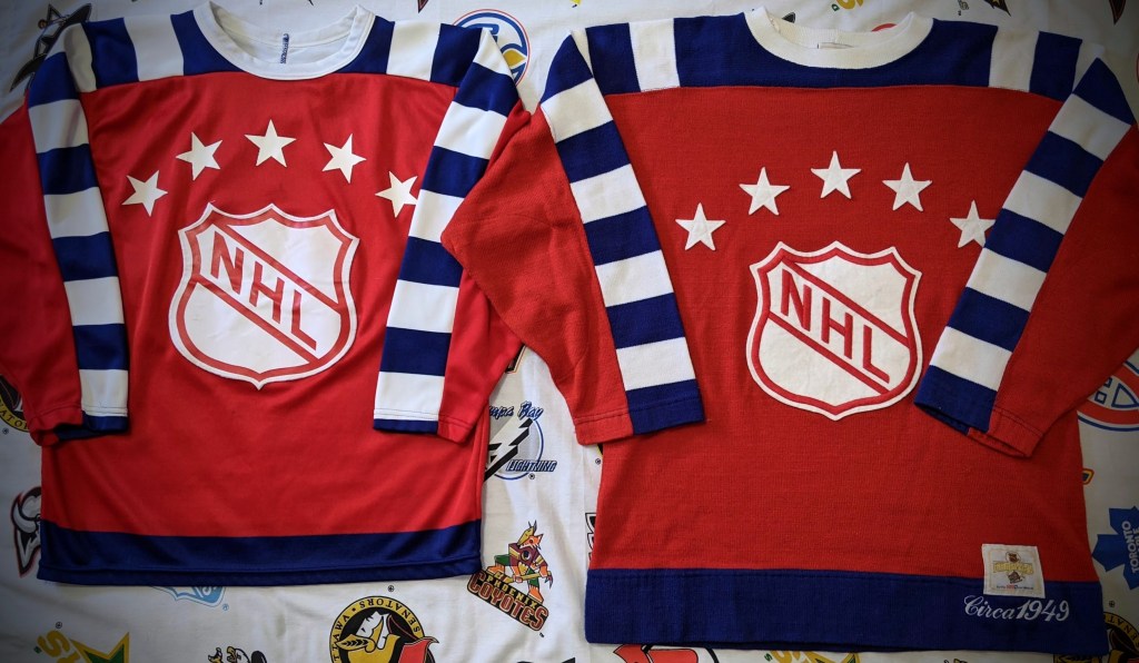 While the 75 logo was everywhere all season long, the Turn Back The Clock (TBTC) jerseys were not. They were worn at first intentionally just among the original six teams playing each other, but then that proved a little difficult because of the color schemes involved, so it turned more into just randomly during the season. Then of course the All-Star Game versions were a one-game-only situation. Much like today, jerseys for special events back then were manufactured at lower quantities compared to a team’s official set of home and away jerseys. Unlike today, however, jerseys in general were produced at far lower overall quantities for the fans back then, making the accessibility to these jerseys extremely limited.